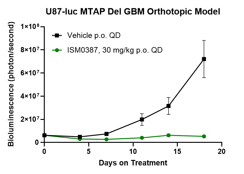 在原位胶质母细胞瘤模型中,连续20天每日给予30 mg/kg的ISM0387可显著抑制肿瘤生长,而对照组则出现明显的肿瘤进展。