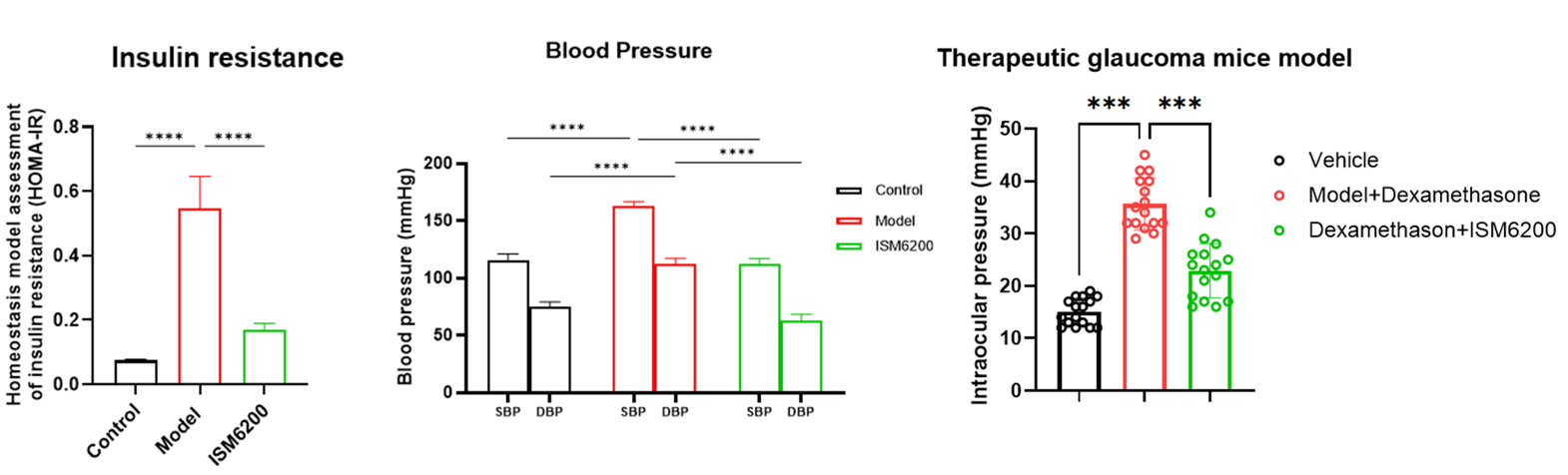 在库欣综合征的大鼠模型中,ISM6200可显著缓解胰岛素抵抗和血压偏高问题,短期用药后即可将胰岛素抵抗水平降低68%,血压也接近健康对照组水平。此外,在治疗型青光眼小鼠模型中,地塞米松注射3天后,ISM6200处理3天,检测发现小鼠眼压显著下降,为后续临床开发提供了线索。