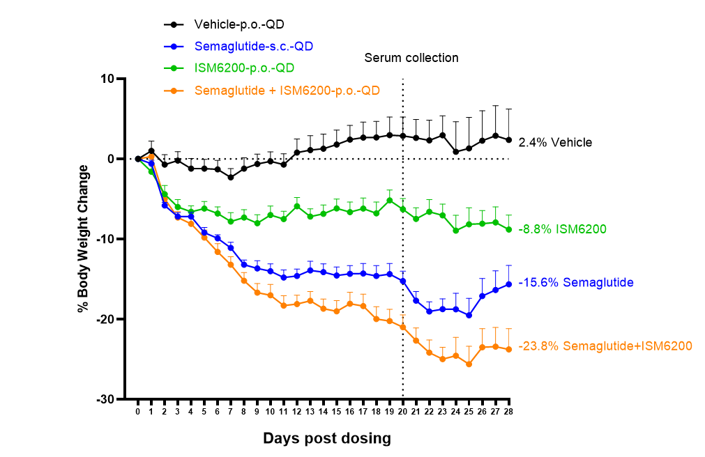 在饮食诱导肥胖(DIO)小鼠模型中,ISM6200表现出良好的减重效果,在主要减少脂肪的同时,更好地保留肌肉量。在28天给药后,与对照组相比,ISM6200单药治疗可实现明显的体重下降,相对基线减重达8.8%。当 ISM6200与司美格鲁肽(Semaglutide)联用时,减重效果进一步增强,于相同给药周期内达到23.8%,而 DIO 对照组体重增加2.4%。以上数据为后续临床开发提供了有力支持。