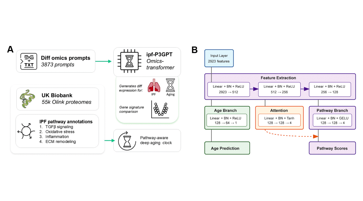 To advance this research, the team developed two specialized deep learning models: fibrosis-aware aging clock, a pathway-aware proteomic aging clock trained on UK Biobank proteomics data, and IPF-Precious3GPT, an omics transformer that generates differential gene expression profiles from text prompts.