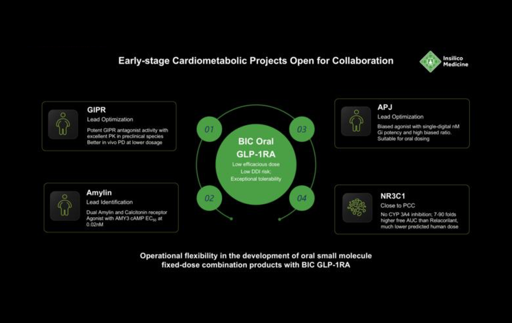 Powered by Insilico’s proprietary end-to-end Pharma.AI platform, the portfolio covers a range of diverse mechanisms and stages from early discovery to preclinical development. It consists of eight oral small molecules with unique properties designed to unlock the full potential of established high-confidence targets such as GLP-1R, GIPR, Amylin, APJ, and Lp(a), as well as moderate-novelty targets such as NLRP3 and NR3C1. The two novel GLP-1RAs are designed for improved safety and pharmacokinetics at low dose to allow for multi-pill combinations with the other molecules in the portfolio. One of the GLP-1RAs is designed to sustain once-weekly (QW) dosing.